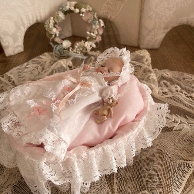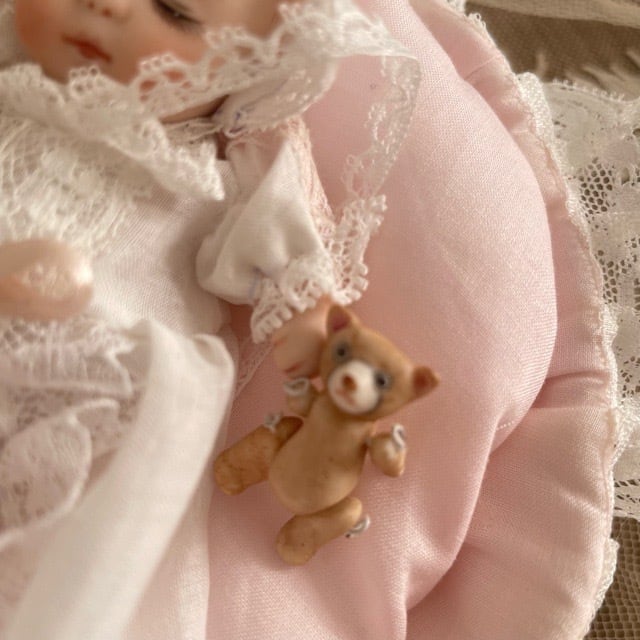 ビスクのベビー、ベッド、ふわふわのお布団、ブランケット、小さなクマちゃんのセットです。